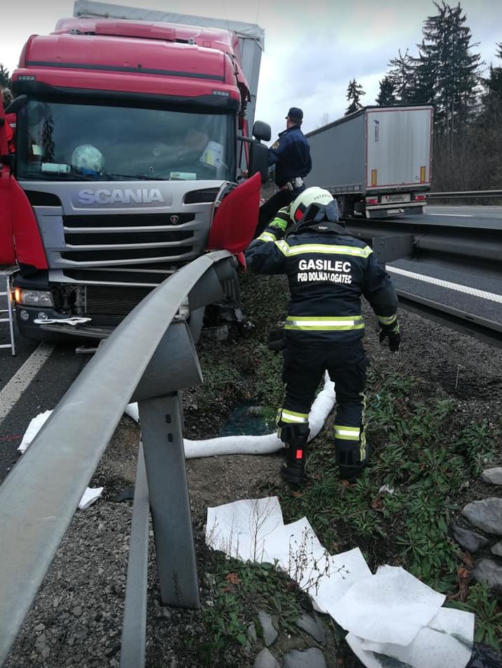 Ob 13:18 je na avtocesti Logatec–Vrhnika vlačilec tovorno vozilo naložen s kartonskimi škatlami zapeljal v odbojno ograjo med prehitevalnima pasovoma in tam obstal. Posredovali so gasilci GB Ljubljana, PGD Dolnji Logatec in Verd, ki so zavarovali kraj dogodka in zaprli hitra pasova v obe smeri. Vozilo je prebilo rezervoar za gorivo, zato je izteklo okoli 400 litrov goriva v jaške in jarek. Gasilci so v sode pobrali okoli 100 litrov nafte iz jarkov in luž. Kraj so posuli z absorbentom in postavili tudi več pivnikov in jih kmalu že prepojene zamenjali. To bo njihova naloga še v naslednjih dneh. Sopotnica v vozilu je utrpela lažje poškodbe. Oskrbeli so jo reševalci NMP Ljubljana in jo prepeljali v bolnico. Ob 20.30 so ponovno posredovali gasilci PGD Verd in zamenjali pivnike na kraju dogodka.
